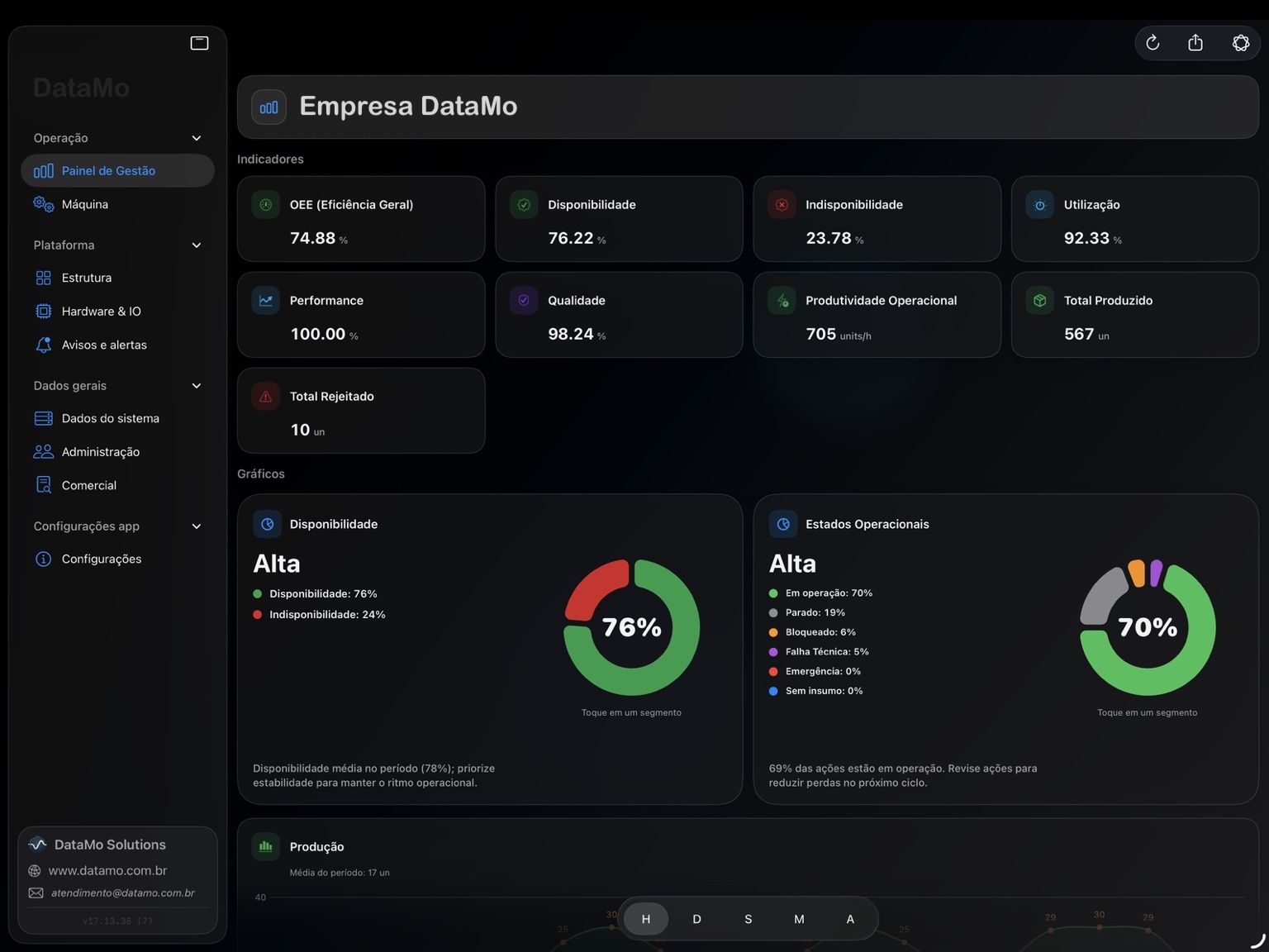 A DataMo reúne coleta industrial, histórico na nuvem e dashboards modernos para transformar sinais de campo em leitura rápida para operação, manutenção e gestão.